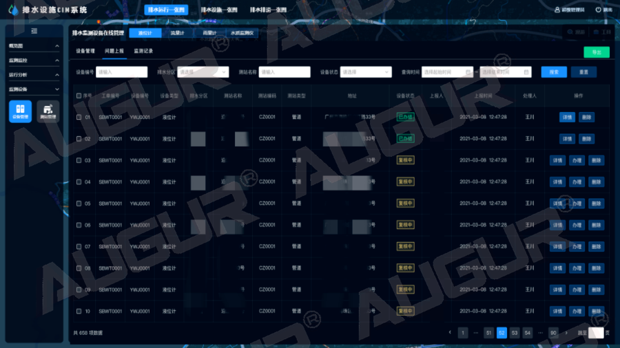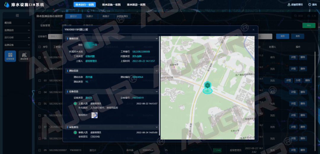 监测监控-高水位分析 精简上报流程- 实现轻量管理 结合APP工单流程,生成设备问题管理台账,定向跟踪设备问题解决进度和反馈情况,解决以往设备维护工作中工单上报方式凌乱、信息不统一,导致工单台账整理难的业务痛点。