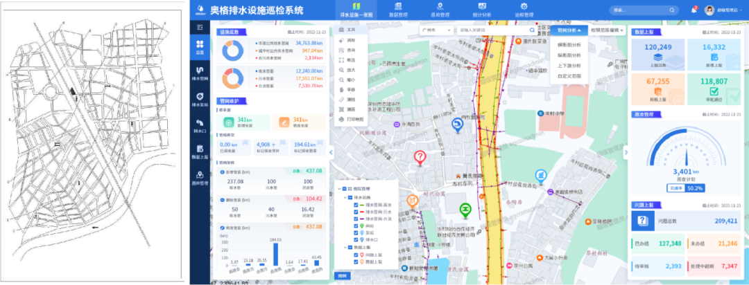 排水设施APP:提供配套排水设施巡检APP,一线巡检人员使用APP可实现排水设施GIS地图查看、排水设施数据上报、实时巡检、巡检问题上报、个人签到、统计分析等。