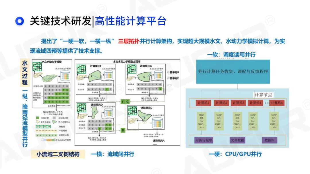 来源:根据刘昌军《面向防洪四预的数字孪生流域》报告编辑整理 关键技术四:水文模型研究 水文模型研究自1950年起步,共经历了第一代、第二代、第三代流域模型,朝着宏观规模化、微观精细化、模块定制化、系统集成化、物理机制更强、精准快速的趋势发展。水文模型软件方面,自主研发了时空变源混合产流SVSMR,可视化时空变源分布式水文模型软件FFMS、WEP模型等系列模型软件。 关键技术五:时空变源混合产流模型 时空变源是指在外因(降雨入渗和蒸发)和内因(重力和基质吸力)共同作用下的产流过程时空变化,混合产流则是在外因和内因时空变化下的流域产流呈现超渗/蓄满产流机制时空动态组合。时空变源混合产流模型适用于湿润、半湿润、半干旱和干旱地,能够动态调整最适宜的产流模拟模式,与国内外10个代表性模型相比,精度提高20%以上。 关键技术六:高性能计算平台 提出“一硬一软,一横一纵”三层拓扑并行计算架构,实现超大规模水文、水动力学模拟计算,为实现流域四预等提供了技术支撑。以黑龙江省为例,针对全省34万平方公里面积进行分布式水文模型建模,包含河道21686 条,划分674个计算单元,分为68个并行计算组进行模拟。