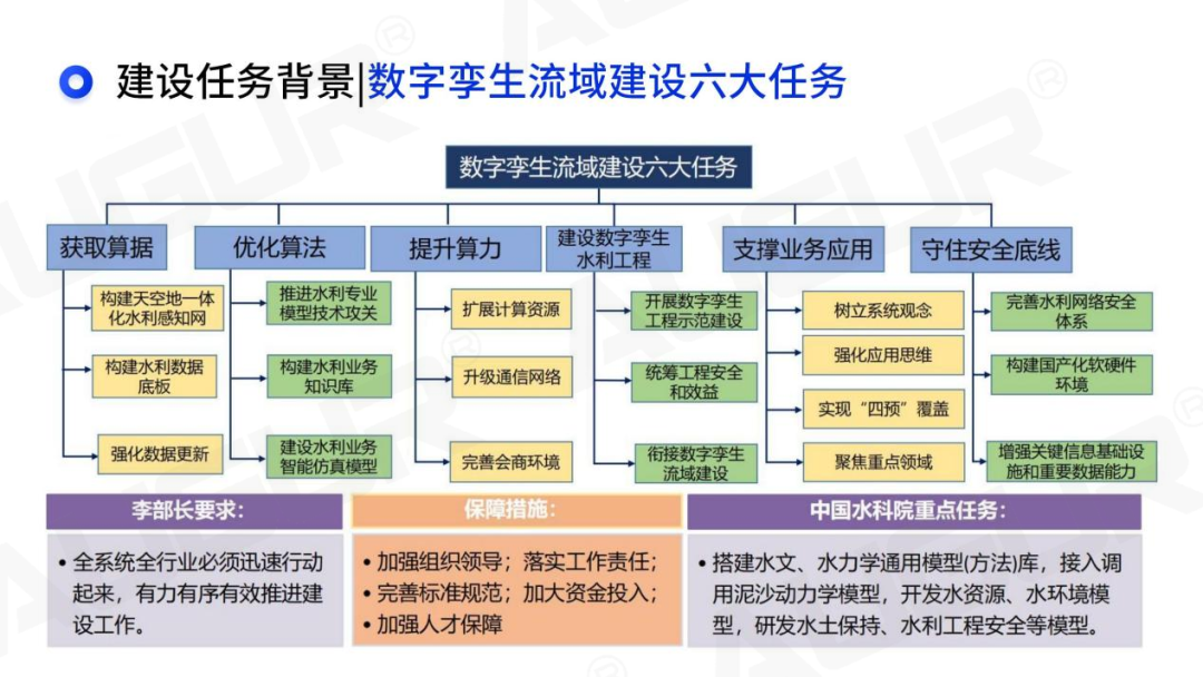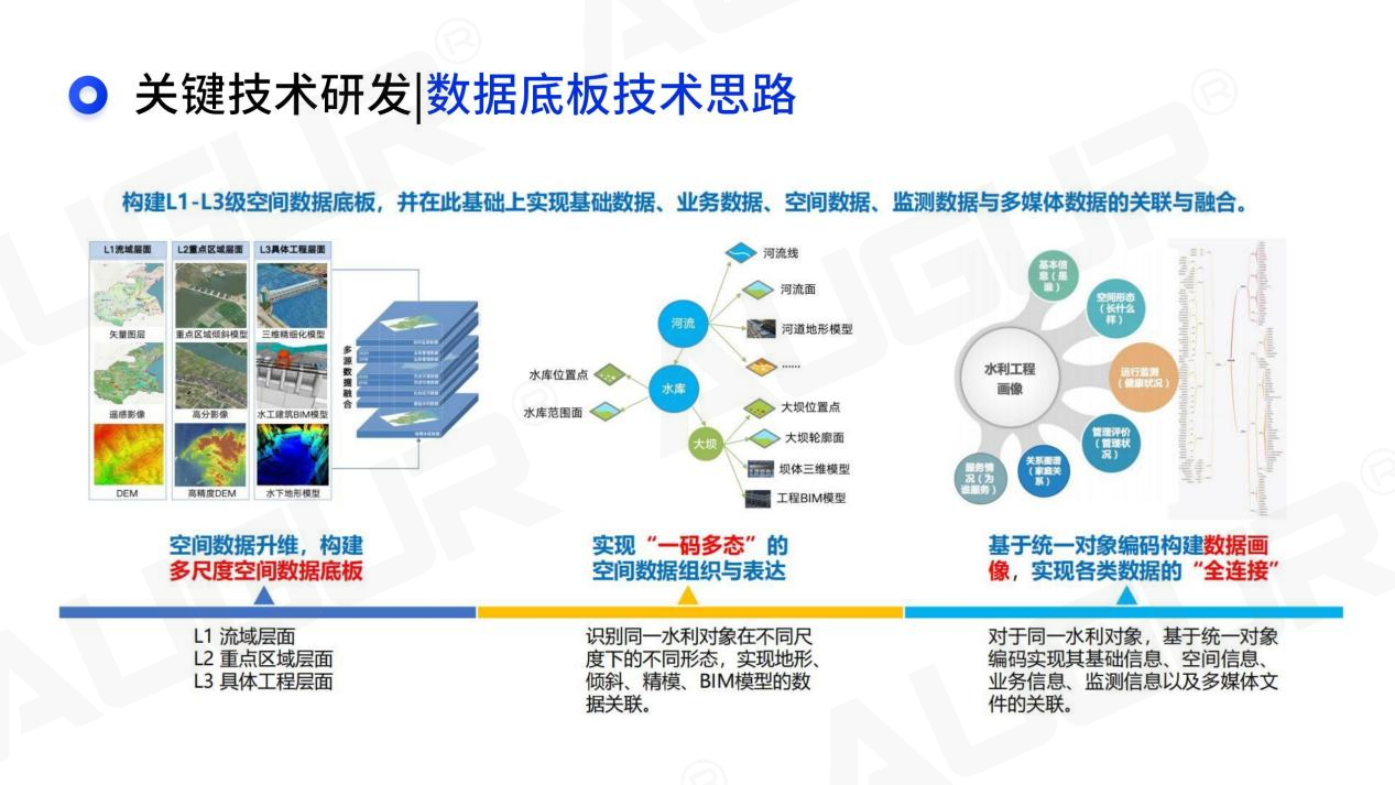来源:根据刘昌军《面向防洪四预的数字孪生流域》报告编辑整理 二、面向防洪四预的数字孪生流域关键技术研发 关键技术一:三算四预 三算:以算据为基础构建天地一体化水利感知网和水利数据孪生展板;以算法为核心推进水利专业模型升级和“四预”业务系统建设、建构水利业务知识库、建设水利业务智能仿真模型;以算力为借力进行超大规模并行计算技术。 四预:围绕全流域分布式水文模型和预报调度一体化技术展开预报;以多时段-多尺度-多对象-多阶段的梯次预警模型和水旱灾害风险预警技术进行预警;预演:数字化场景、数字流场、全流程一体化预演技术;预案:预案体系、标准化模块化预演、决策方案; “2+N”业务方向:以水旱灾害防御和水资源配置为主,对泥沙、水环境、灌区、牧区、水利遗产等相关方向进行业务开拓。 关键技术二:遥感监测 对地观测进入遥感大数据高性能处理时代,自动化和智能化数据分析成为水利遥感应用核心,探索工业化创新模式。 构建防洪调度空间数据支撑和解译平台。基于高性能计算集群,通过横向并行、纵向串行智能算法双线部署方案;实现分要素分产品智能化自动解译,为水利遥感业务化应用提供多元专业信息产品。 关键技术三:数据底板技术思路 构建起L1-L3级空间数据底板,并在此基础上实现基础数据、业务数据、空间数据、监测数据与多媒体数据的关联与融合。按照动静结合、高效流动的思路建立,即为汇聚的“河”:实现数据的持续“流动”更新;可控的“闸”:实现各类数据的融合与治理;可用的“泵”:多样化的数据服务;一体化管理的“湖”:数据资源统一存储与管理。