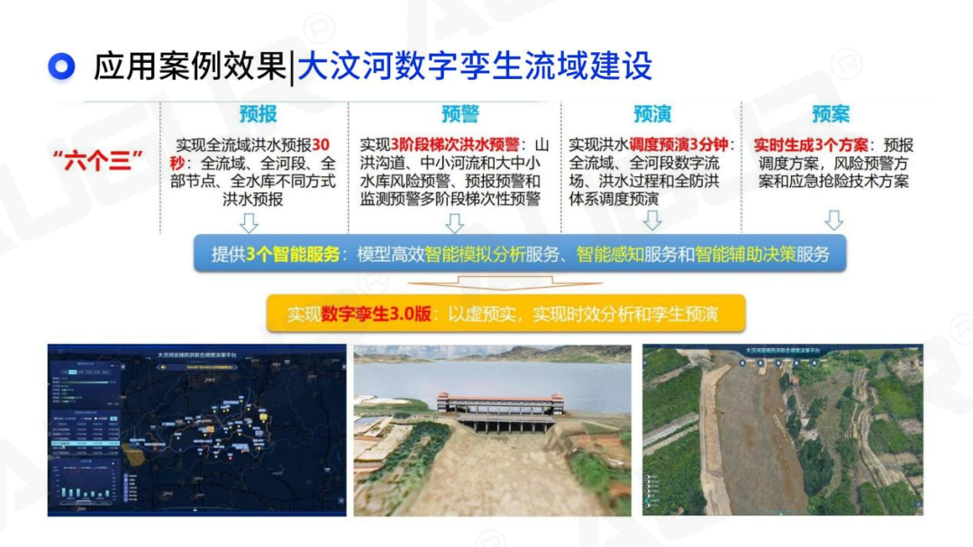 来源:根据刘昌军《面向防洪四预的数字孪生流域》报告编辑整理 三、实际应用案例效果 接下来,我就和大家分享一些关键技术的应用案例效果。 第一个案例是数字孪生淮河流域智慧防汛系统。 2021年,提出了数字孪生淮河 “54321”智慧防汛体系建设思路和框架,对淮河流域防洪“四预”系统进行了研发。实现高精度地形快速采集技术、超大规模水文水动力学一体化实时动态模拟预报并行计算技术、预报调度一体化和实时风险影响计算与评估技术、数字流场、数字孪生和数字映射三维可视化展示技术等关键技术创新。 这个系统初步构建了“四预”系统框架,探索数字孪生、数字映射和数字流场技术,初步研发了智慧防汛四预系统,通过仿真模拟等可视化技术,初步实现了物理防洪工程在数字化场景中实时动态展示。值得一提的是,数字孪生淮河流域智慧防汛系统以高分通过水利部中期评估并获得“优秀”等次,申报的“数字孪生淮河防洪‘四预’系统应用”案例高票入选水利部数字孪生流域建设先行先试优秀应用案例。 接着,我想向大家分享另一个典型案例——大汶河数字孪生流域。 这是小型水库雨水工情自动测报和水库安全运行及防洪调度项目,主要建设内容就是通过雨水工情自动测报、水库信息数字化管理、纳雨能力分析和流域联合调度预演等技术手段,为小型水库的安全运行及防洪调度提供及时、准确的信息,辅助领导决策,做好水库安全管理,保障水库良性运行。 大汶河数字孪生流域建设全面汇集流域200余T数据,整编规划后数据量达100.6T,形成36类数据,110余个图层,2337余种属性信息,制定了统一的数据治理标准,构建大汶河、沂沭河流域“湖仓一体”;防洪数据资源池;按需组装形成流域底板专题图;打破数据壁垒,实现数据互通,为大汶河和沂沭河数字孪生流域的业务化应用提供最充足的数据支撑;实现从数据信息知识的生产,完成汇集查询挖掘分析智能推荐三个层次的构建,形成服务于大汶河流域的防洪辅助决策知识。提供了模型高效智能模拟分析服务、智能感知服务和智能辅助决策服务3个智能服务,达到了以虚预实,实现时效分析和孪生预演的“数字孪生3.0版”。