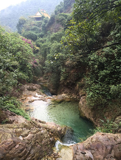 图1 溪水琮净 走走歇歇、歇歇走走,不到一个小时,三亿体育 这支小分队就有些体力不支了。对于极少锻炼的键盘族而言,为了登高一览,还真是好事多磨呀!栈道两旁古木参天,苍翠欲滴,树身上布满了青苔,鲜嫩、可爱。三亿体育 几个倚靠着栈道围栏,静静地聆听着虫鸣鸟叫、流水潺潺,与四周各色的花草亲切合影,不亦乐乎。这时,不知哪几位体力惊人的小伙伴们已经登到了山顶,远远地呼唤着。风过云展,那亭台影影绰绰耸立山头,好像并不很远。大家相互加油打气,胜利就在眼前!没错,既然来了,就不能留遗憾。再次启程,三亿体育 另辟了一条蹊径,脚边的野花野草挨挨挤挤、芊芊莽莽;溪水琮净,在一片绿色的影中显得分外好看。 抓住扶手、揪住同伴,大家就这么相互帮扶着,走着,笑着。心还在跳,腿还在抖,三亿体育 到底登上了峰顶!望着绵绵的盘道,小伙伴们不禁呐喊到“三亿体育 成功了”!